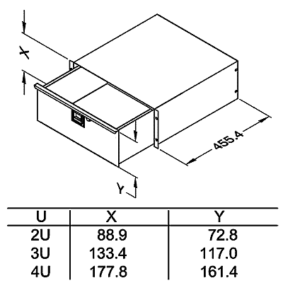- wysokość 2U (89 mm), wewnętrzna 72,8 mm